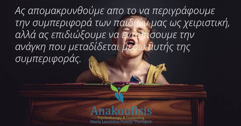 Σκεφτήκατε τι θα συμβεί αν επαναπλαισιώνουμε την ερμηνεία μας για τη συμπεριφορά του παιδιού μας από το “το παιδί μου προσπαθεί να με χειραγωγήσει ώστε να πάρει αυτό που θέλει” σε “το παιδί μου εκφράζει μια ανάγκη”; θα νιώθατε διαφορετικά; θα άλλαζε η συμπεριφορά σας απέναντι του;