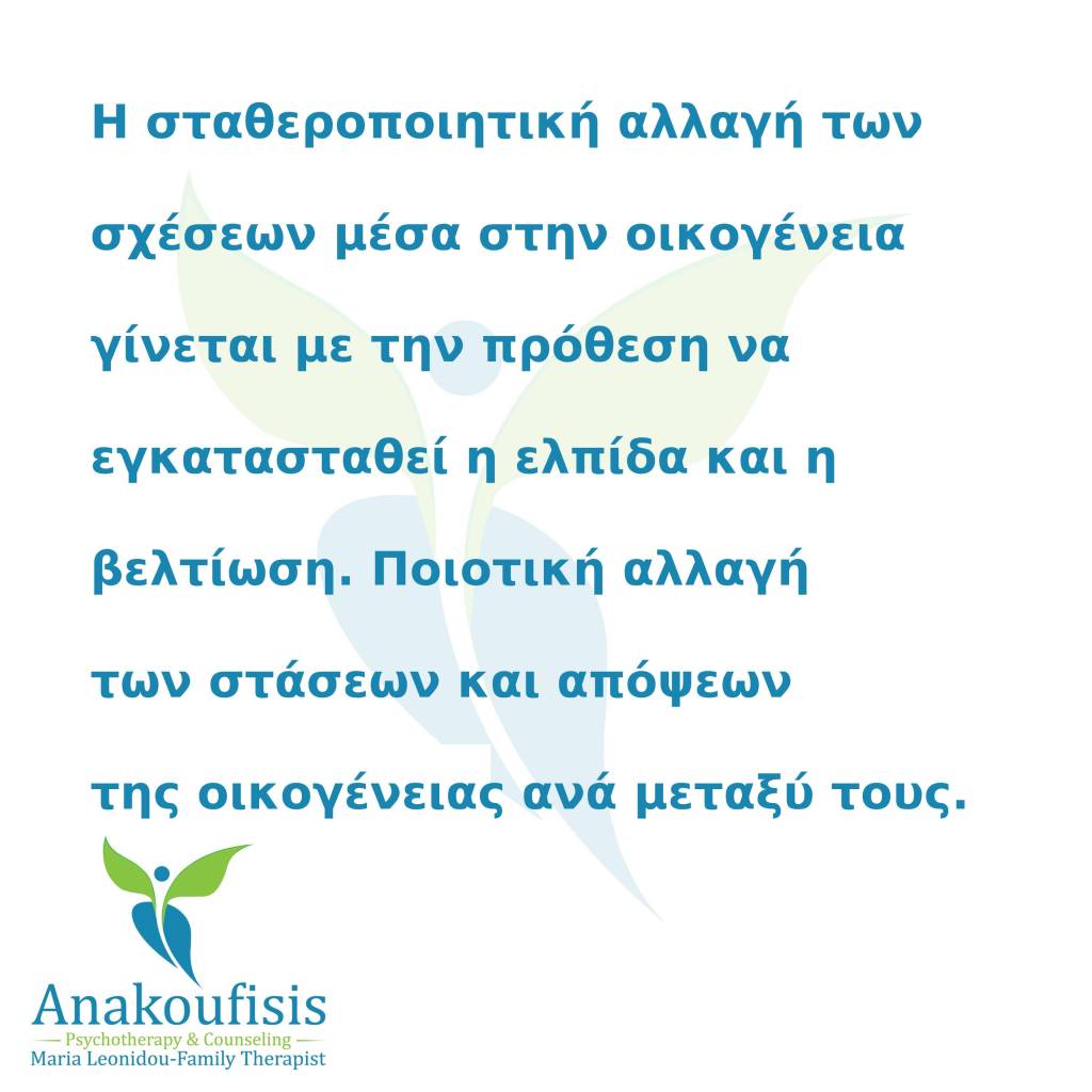 Η σταθεροποιητική αλλαγή των σχέσεων μέσα στην οικογένεια γίνεται με την πρόθεση να εγκατασταθεί η ελπίδα, και η βελτίωση. Ποιοτική αλλαγή των στάσεων και απόψεων της οικογένειας ανά μεταξύ τους.